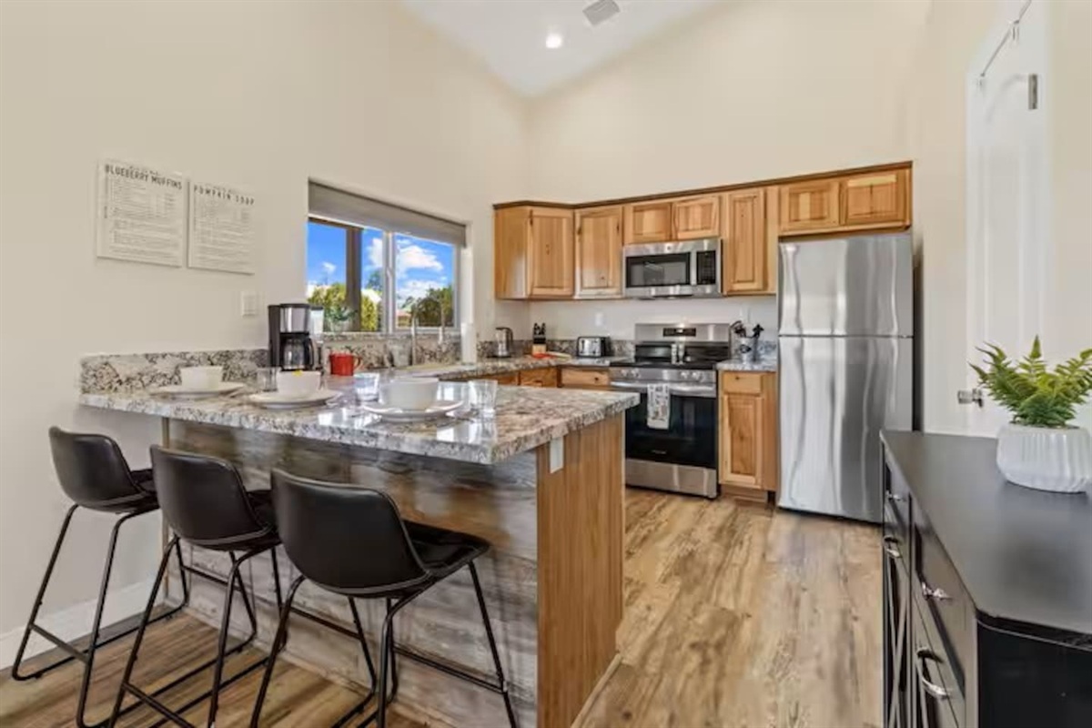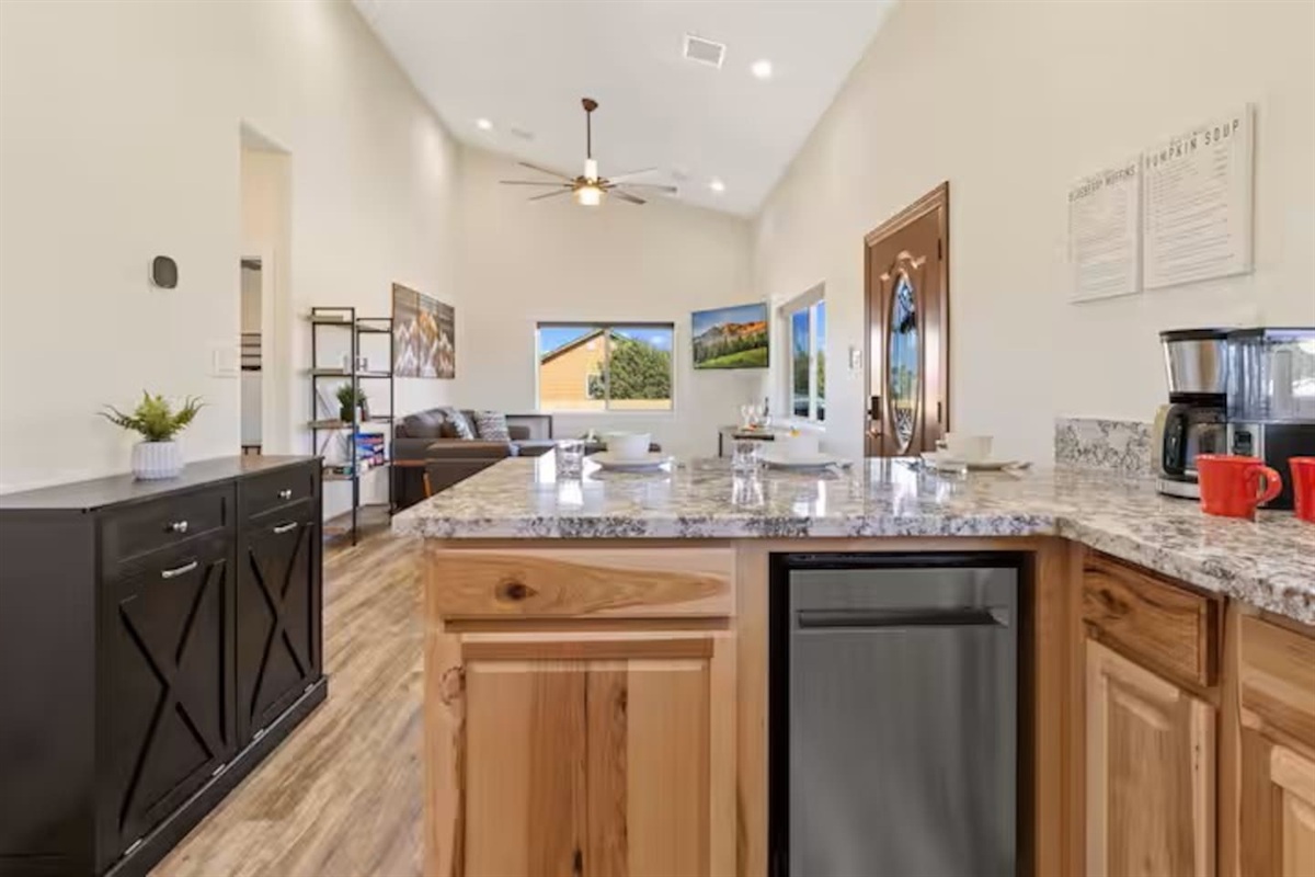 • Coffee bar ☕: drip coffee maker, coffee grounds, tea, hot chocolate mix, sugars, dry creamer