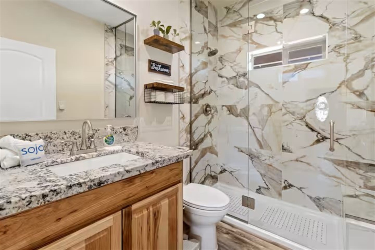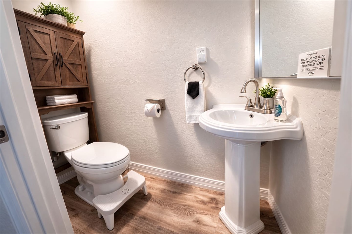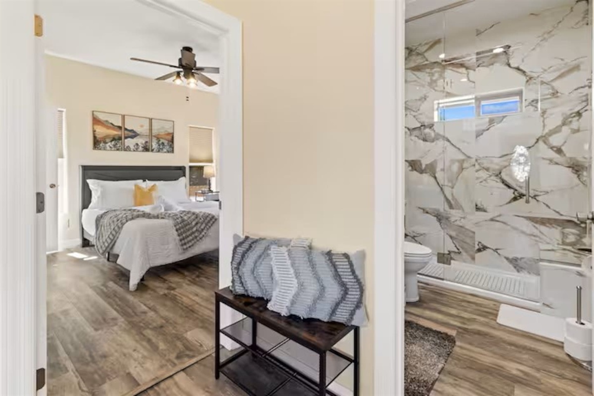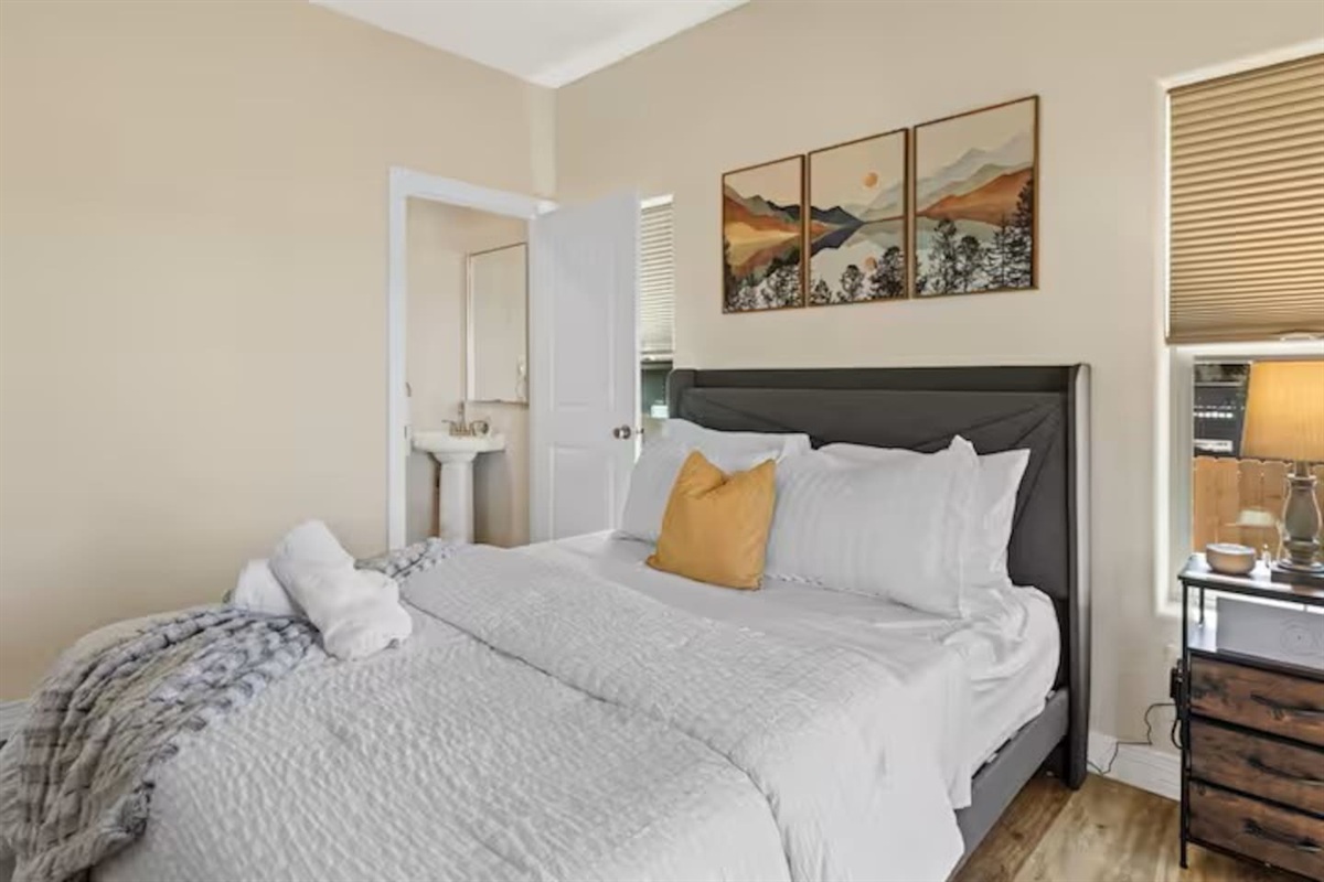 • Primary bedroom: Queen bed with private ensuite bathroom (toilet & sink only)