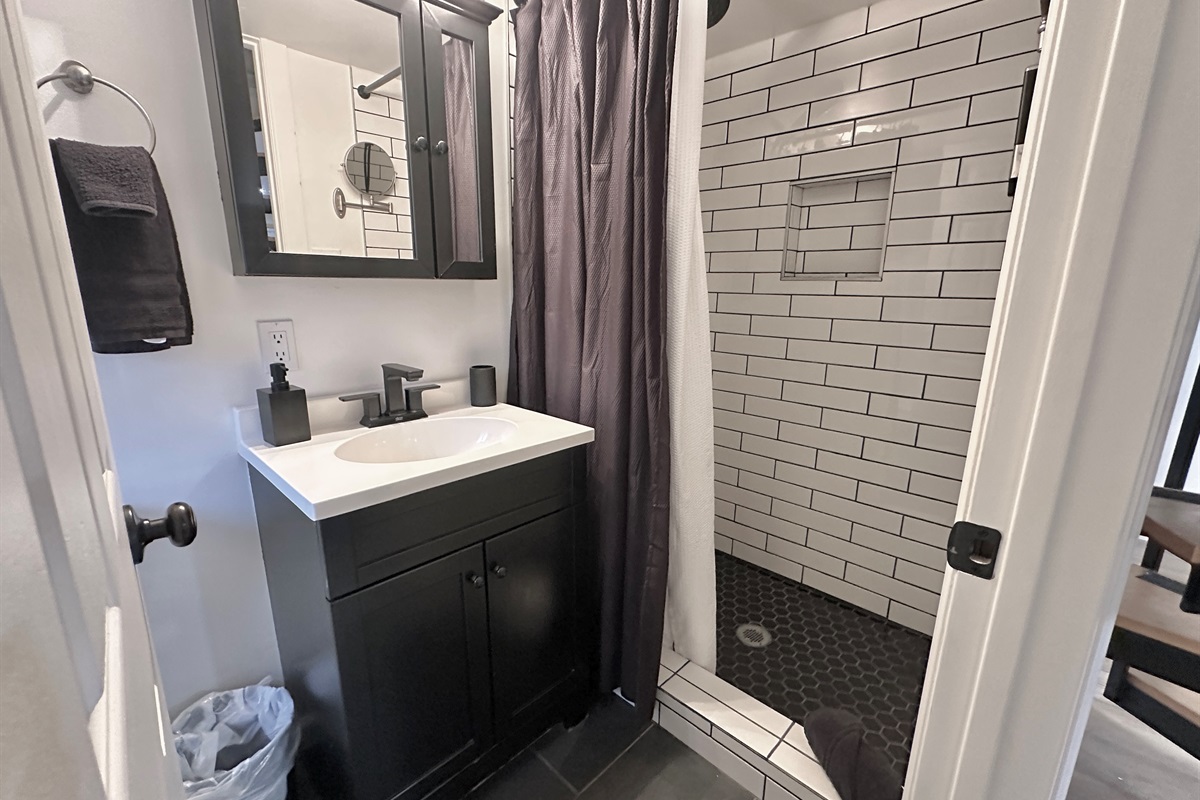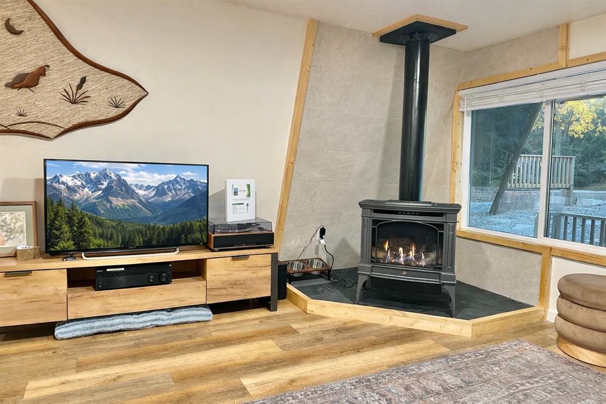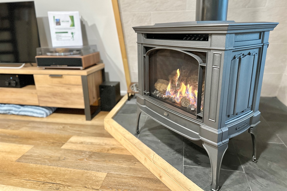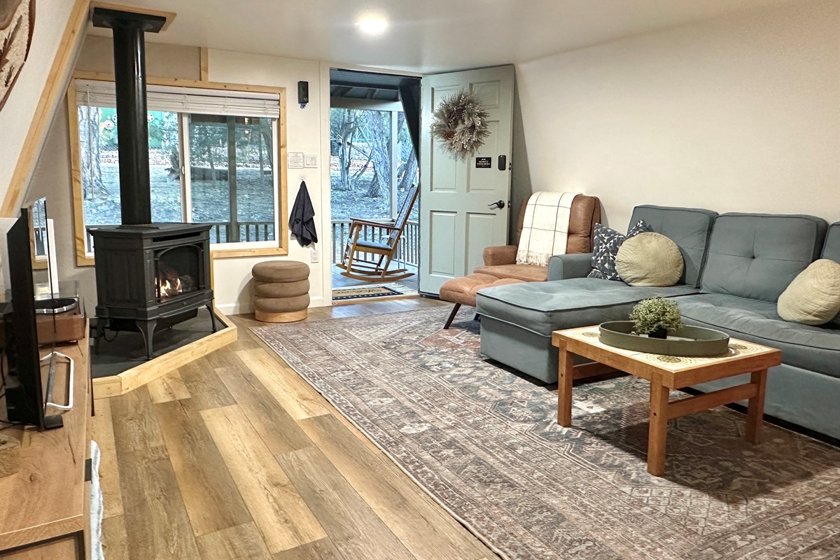 1st level: you will find a comfortable living area with tv & gas fireplace, record player, bathroom with walk in shower, quaint kitchen equipped for making meals, and 2 porches for outdoor relaxation.
